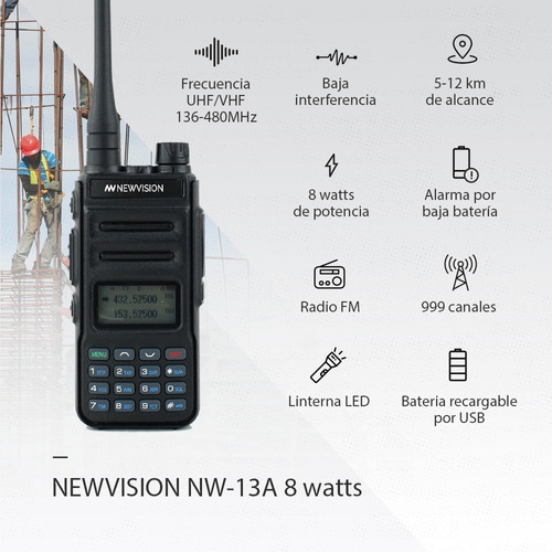 -> Características: • Marca: Newvision. • Modelo: NW-13A • Bi-Banda. • Frecuencias : VHF 136-174mhz / UHF 400-548mhz. • Potencia 8W. • Canales: 999. • Alcance: 5 a 10km en ciudad – 10 a 20km en campo abierto – 20 a 50km modo base. • Visualización en la pantalla «LCD» con menu de funciones. • Con codificación DTMF. • Batería de Ión- Litio de alta capacidad. • Autonomía batería: 10 a 12hs aprox. • Receptor de radio comercial en FM (65 MHz – 108 MHz). • Incorpora 208 códigos «DCS» y 50 códigos de privacidad «CTCSS» programables. • Función «VOX» (transmisión activada por voz). • Posibilidad de seleccionar alta potencia o baja potencia de transmisión. (8w/5w). • Función pitido “beep” en el teclado. • Escucha dual/ recepción dual. • Posibilidad de seleccionar los pasos de frecuencia de 2.5 /5/6.25/10/12.5/25 kHz. • Función «OFFSET» (desplazamiento de la frecuencia de acceso del repetidor). • Función de ahorro de batería “SAVE”. • Tiempo de transmisión “TOT” programable. • Selección de Modo Escáner. • Función de bloqueo de canal ocupado “BCLO”. • Escáner de recepción CTCSS/ DCS integrado. • Luz flash tipo LED integrada. • Nivel del Umbral «Silenciador» ajustable desde 0 a 9. • Operación en bandas cruzadas “Crossband”. • Tono de fin de transmisión. • Tecla de bloqueo integrada.